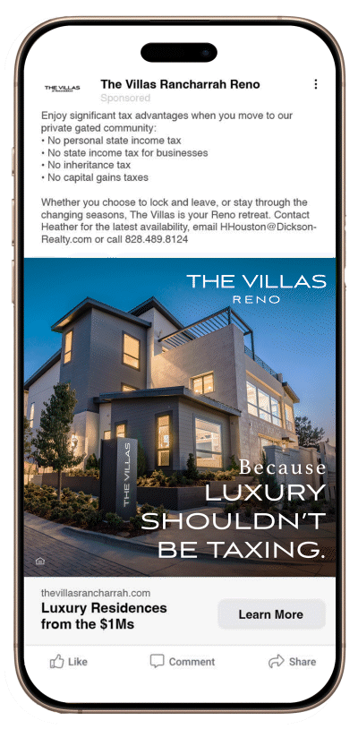 The strategy and creative direction depict Reno in a new upscale light. Advertising targets, the Bay Area and Silicon Valley with “tax friendly” messaging, and the local Reno community of empty nesters with advertising that promotes the low-maintenance lifestyle and the amenities of private club membership located just next door. Google, Meta and real estate search media are analyzed and optimized monthly. Sales are tracked to form-fills and web visits.